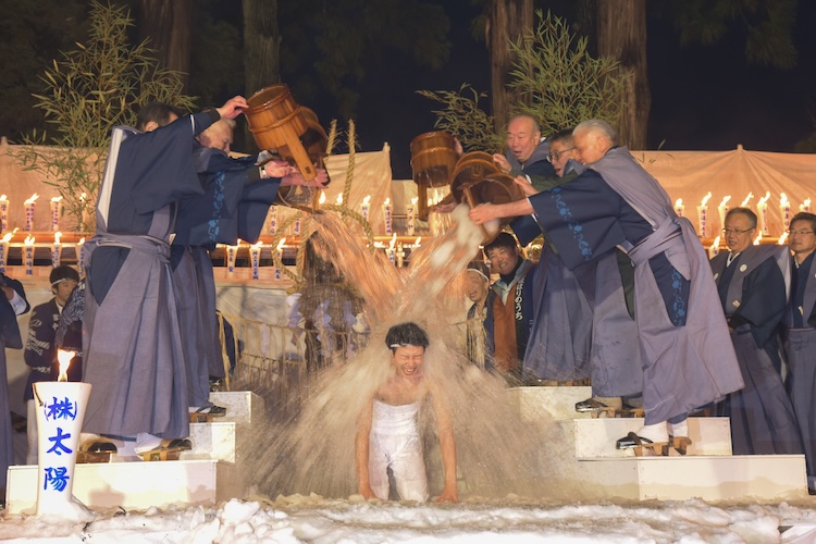 祭りのクライマックスでは、極寒のなか新婿に御神水をかけて子宝や夫婦和合を願う『水祝の儀』がおこなわれます。