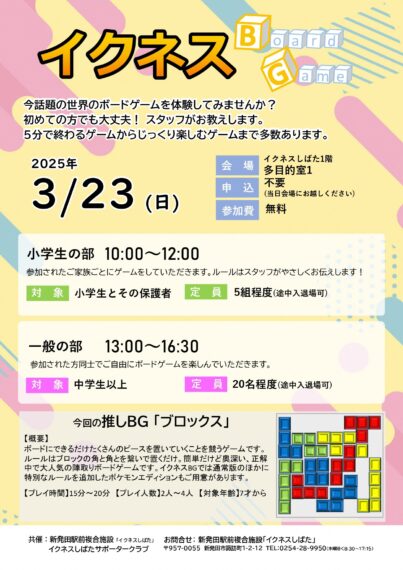 3月23日(日)に、新発田駅前複合施設「イクネスしばた」でボードゲームイベントが行なわれます。