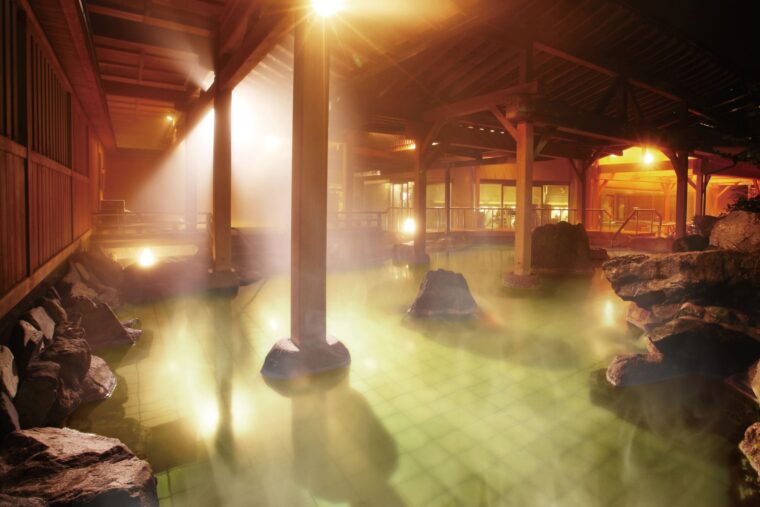 エメラルドグリーンに輝く自家源泉の湯は 全国屈指の硫黄含有量を誇り、入浴後のお肌は、 まさに白玉のようにしっとりなめらかと評判です。