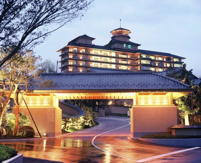 昨年末「プロが選ぶ日本のホテル・旅館100選」の1位に選ばれた白玉の湯 華鳳。モダンで広々としたロビーからは6,000坪の大庭園を一望できます。