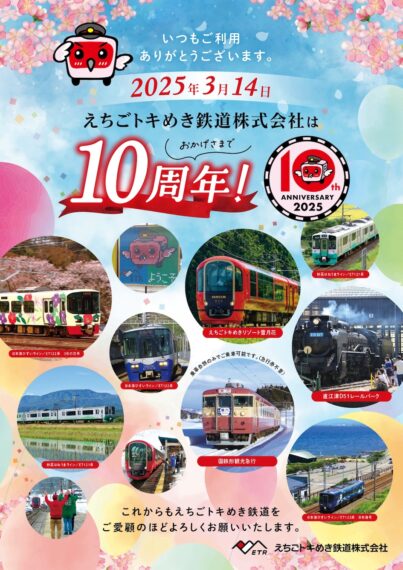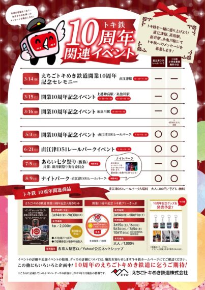 なお、イベント当日はえちごトキめき鉄道全線をお得に乗車できる『開業10周年記念 トキ鉄フリーきっぷ』の利用が可能な日です。大人1,000円、小学生以下の子どもはなんと無料で乗り放題です。