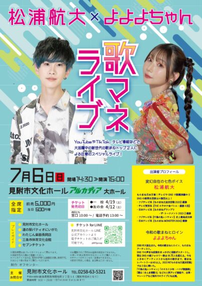 SNSやテレビ番組で活躍中の歌マネタレント、松浦航大とよよよちゃんのスペシャルライブが、見附市文化ホールアルカディアで7月6日(日)に行なわれます。