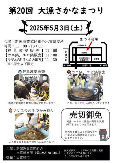 20回目を迎える大人気イベント『大漁さかなまつり』が、5月3日(祝)に出雲崎卸売市場で開催されます。