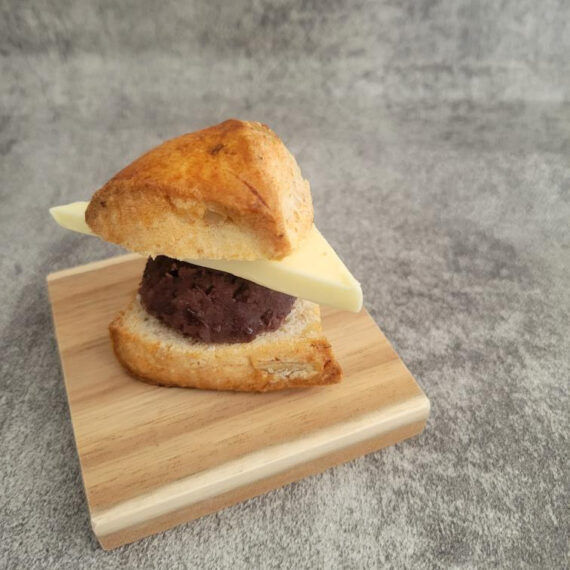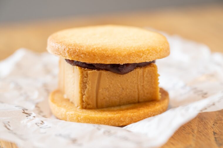 定番の『みそキャラメルチーズケーキ』と、しっかりとした粒感を楽しめる小倉練りあんを自家製クッキーでサンド。
