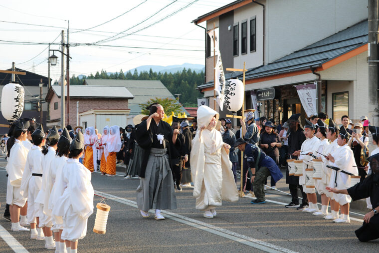 当日は、15:30より住吉神社で花嫁旅立ちの儀が実施され、狐メイクを施した花嫁花婿が多くのお供とともに町内を練り歩きます。