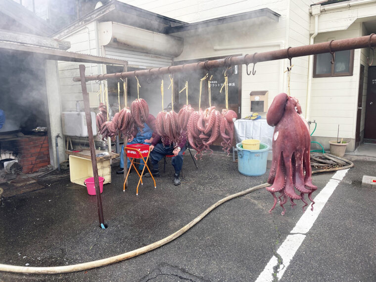 1〜3月頃に茹でたてのミズダコを道端でつるし売りしているのが、新川漁港の冬の風物詩です。