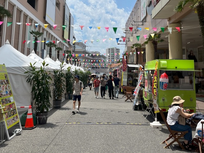万代シテイビルボードプレイスとBP2の間の道路が歩行者天国になり、県内から20店舗以上が集結。こだわりのグルメやスイーツ、ドリンクを楽しめます。