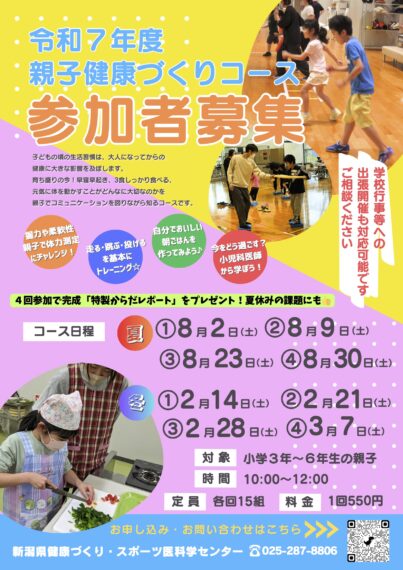 そこで! 新潟県では、小学3年~6年生の親子を対象に、健康や体力について学びながら親子の絆を深め、子どもの健やかな発育と保護者の健康的な生活習慣の確立を目指す『親子健康づくりコース』(年2回開催)を企画し、その参加者を募集しています。