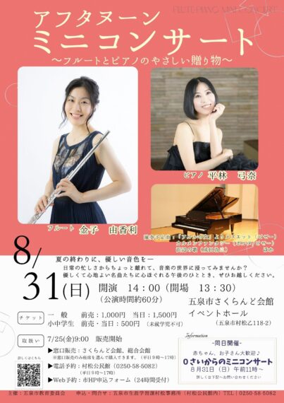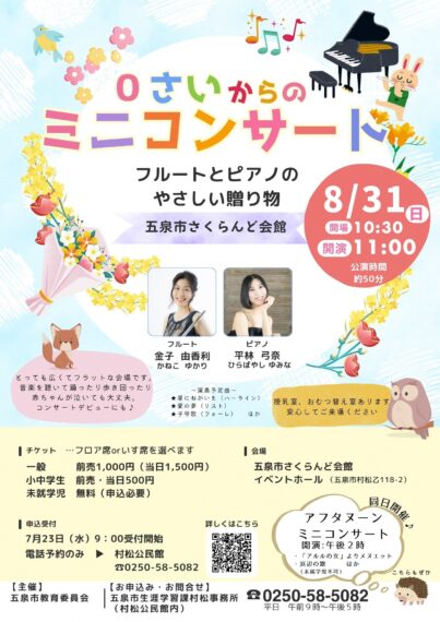 五泉市さくらんど会館で8月31日(日)、親子向けのコンサートが開かれます。