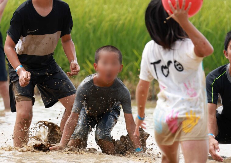 参加者たちが泥だらけになりながら、田んぼのなかでドッヂボールやバレーボールといった競技を繰り広げる姿は必見です!