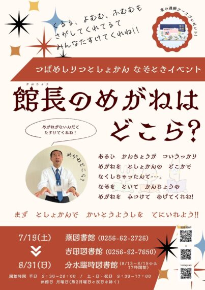 燕市立図書館、吉田図書館、分水臨時図書館の3館をめぐってヒントを集める謎解きイベントが8月31日(土)まで開催されています。