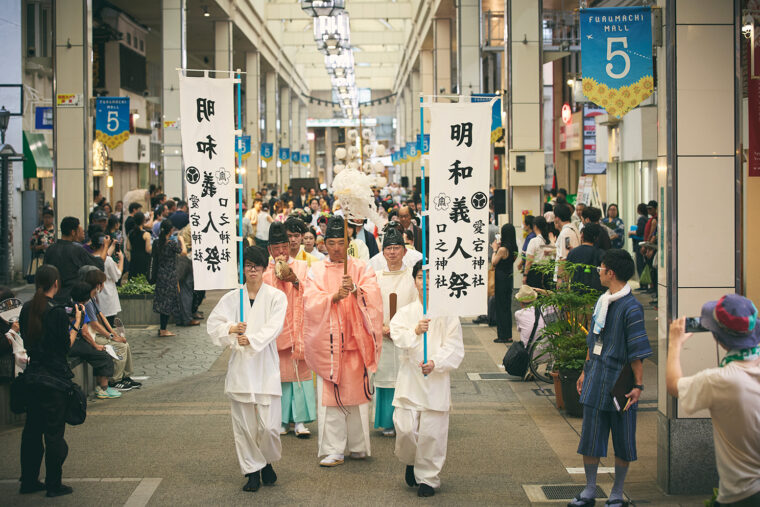 江戸時代に見立ててまちを練り歩く『明和義人行列』や古町芸妓舞・万代太鼓の披露、お菓子を神菓として振る舞う『明和神菓まき』などを実施します。