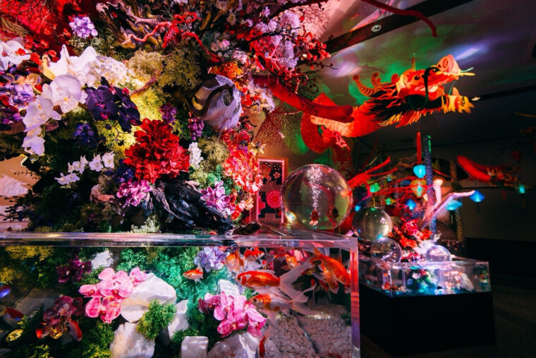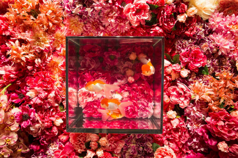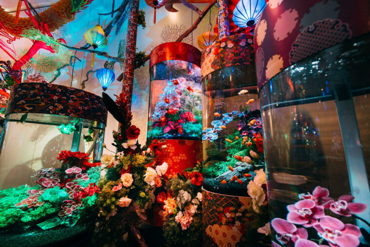 「アート× 金魚」、そして「祭」をテーマに、花々の装飾や光、映像などを駆使して会場を華やかに彩ります。