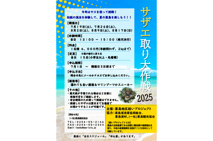 対象は小学生以上で、ひとりあたり最大2キロまでのサザエ採捕が可能。各日定員15名の先着順。申し込みは開催日の3日前までとなっています。ぜひご家族や友人と一緒にチャレンジしてみましょう。