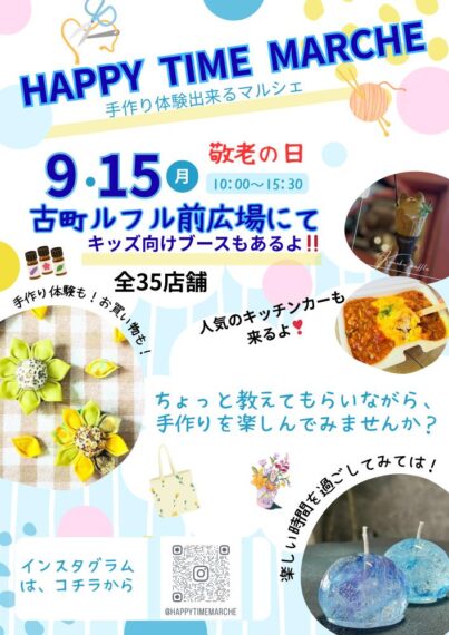9月15日(祝)に、古町ルフル広場でマルシェイベント『HAPPY TIME MARCHE 』が開催されます。