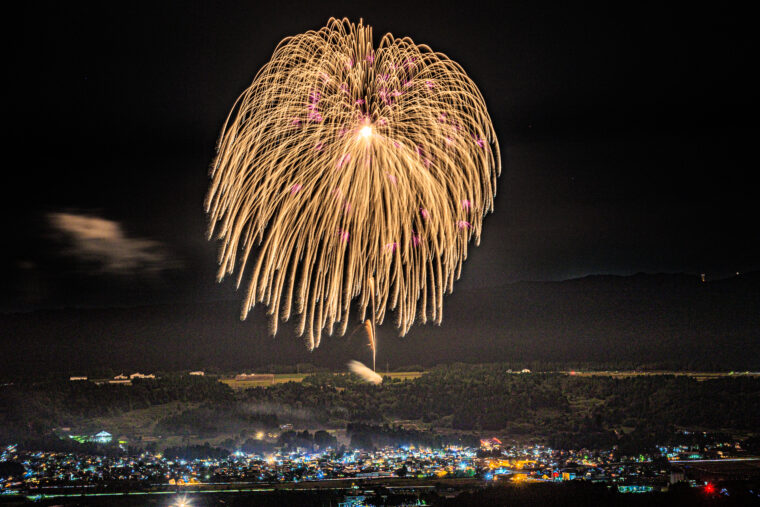 『片貝まつり』は浅原神社の秋の例大祭で、打ち上げられる花火は浅原神社への奉納を意味します。なかでも直径約800メートルにもおよぶ四尺玉は、轟音とともに闇を切り裂き、大輪の光の花を咲かせます。