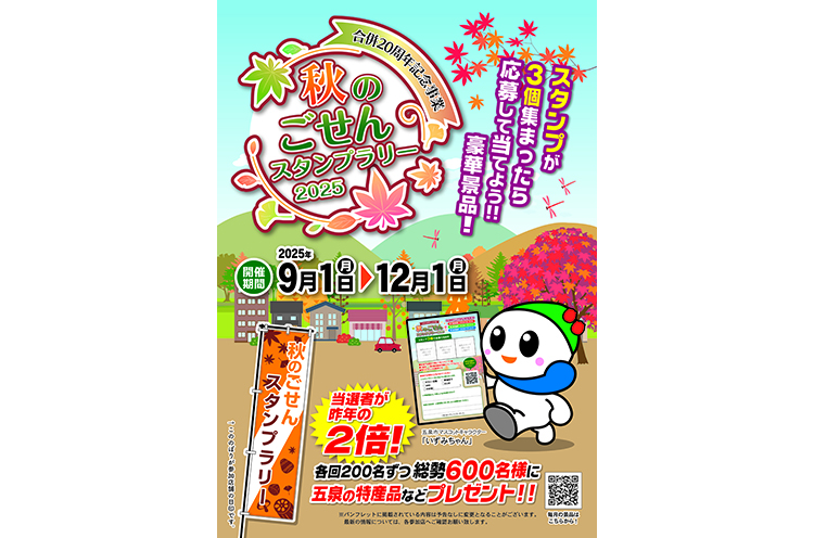 五泉市内の観光施設やイベント会場、参加飲食店や直売所などをめぐってスタンプを集めると、五泉の特産品などが当たる抽選に応募できます。