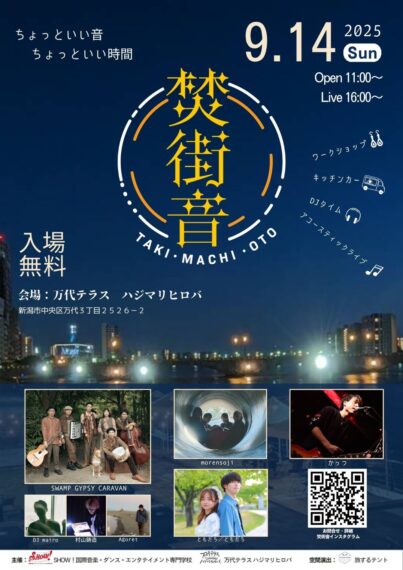 『焚・街・音 2025(タキマチオトニーマルニーゴー)』は、新潟市古町にあるSHOW!国際音楽・ダンス・エンタテイメント専門学校にて、音楽やエンタメを学ぶ学生たちが自ら企画・運営を手掛ける注目の音楽イベントです。