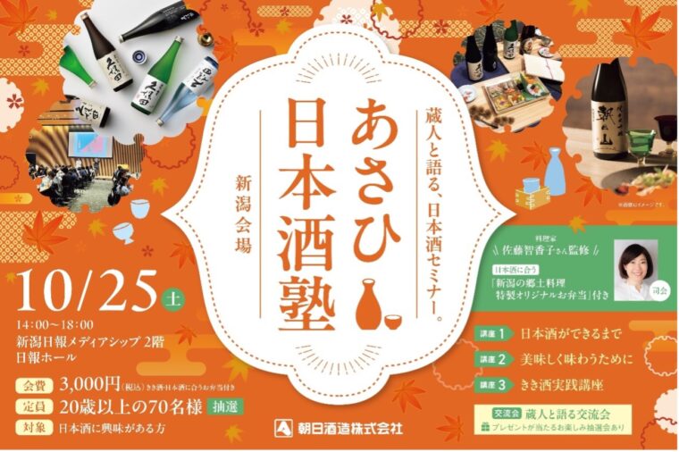 『あさひ日本酒塾』は、新潟県を代表する『久保田』や『朝日山』などの日本酒を造っている長岡市の酒蔵、朝日酒造が開催する日本酒セミナーです。