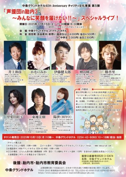 胎内市の中条グランドホテルを会場に、チャリティイベント『「声援団in胎内3〜みんなに笑顔を届けたい!!〜」スペシャルライブ!』が開催されます。