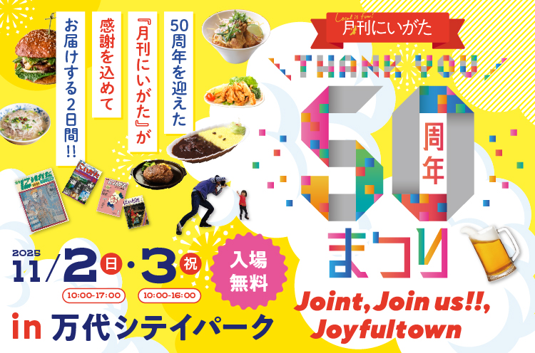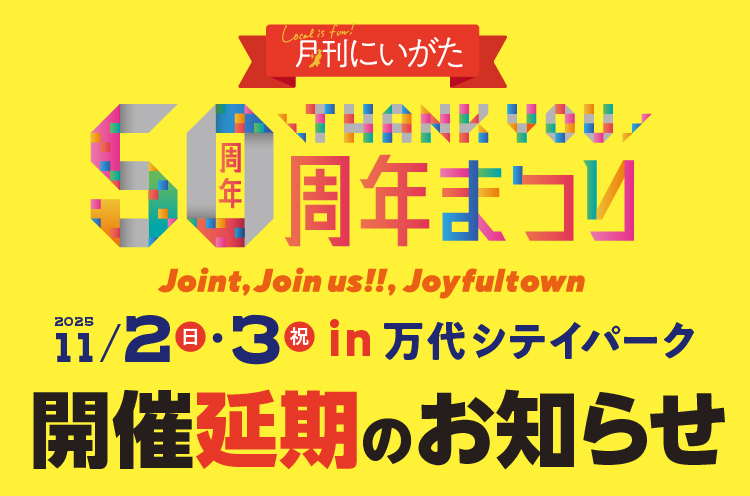 なお、『Thank you! 月刊にいがた50周年まつり』につきましては日を改めて開催する予定ですので、日程が決まり次第、再度ご案内をさせていただきます。