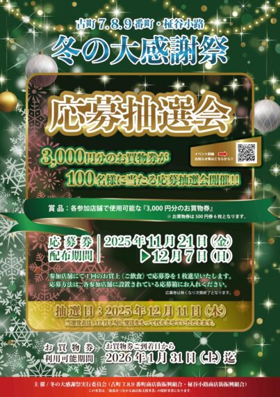 イベント 3,000円分のお買い物券が当たる応募抽選会を開催|新潟市中央区古町 古町7.8.9番町・柾谷小路 冬の大感謝祭 新潟市中央区イベントイベント 情報掲載日:2025.11.24 ※最新の情報とは異なる場合があります。ご了承ください。 Tweet 新潟市中央区の古町7.8.9番町と柾谷小路で、『冬の大感謝祭』として応募抽選会が行なわれます。 11月21日(金)〜12月7日(日)の期間に、古町7.8.9番町と柾谷小路の参加店でお買い物や飲食をすると、応募券が1枚進呈されます。 この応募券を各店に設置されている応募箱に入れれば応募完了。 12月11日(木)に抽選が行なわれ、3,000円分のお買い物券が100名に当たります! この機会にぜひ古町7.8.9番町と柾谷小路へおでかけください! 古町7.8.9番町・柾谷小路 冬の大感謝祭 応募抽選会