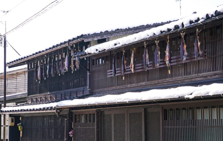 村上の鮭料理の代表格・塩引き鮭が軒下に吊り下がる様子は、この時期の村上の風物詩です。