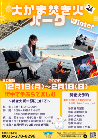 2月1日(日)まで、朱鷺メッセ向かいの万代島多目的広場 大かまで焚き火を楽しめるイベントを開催中です。