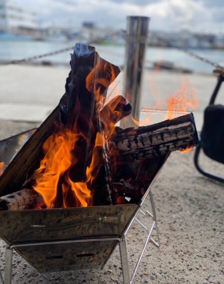 料金は1組・60分で1,000円。焚き火台、イス、薪、トングなど必要な道具は貸出できるので、手ぶらで焚き火を楽しめます。