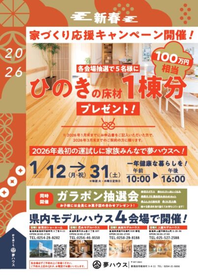無垢材にこだわった健康住宅でおなじみの夢ハウスが、1月12日(祝)から31日(土)まで『新春 家づくり応援キャンペーン』を開催します。