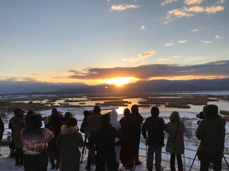 一面に広がる潟と、山の端から昇る朝日を一望すれば、感動すること間違いなし。