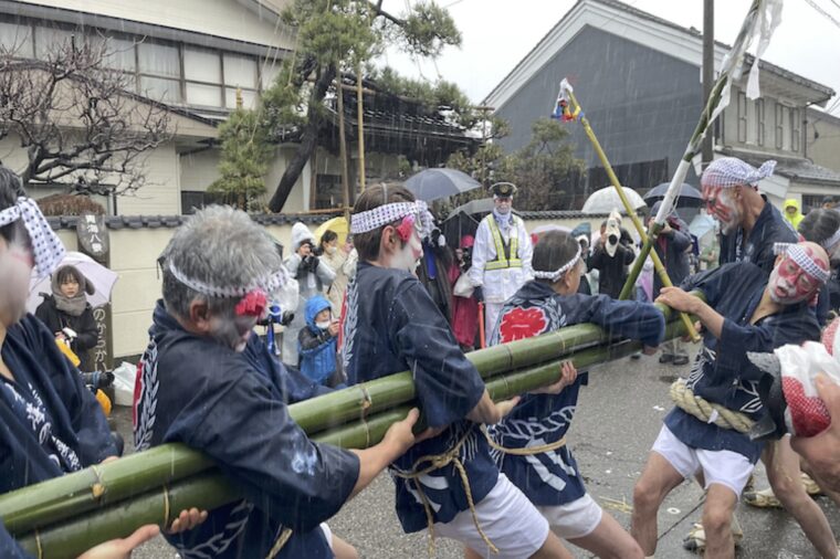 2本の青竹を組み合わせ、顔に隈取りをした若い衆が東西に分かれ引き合い、
