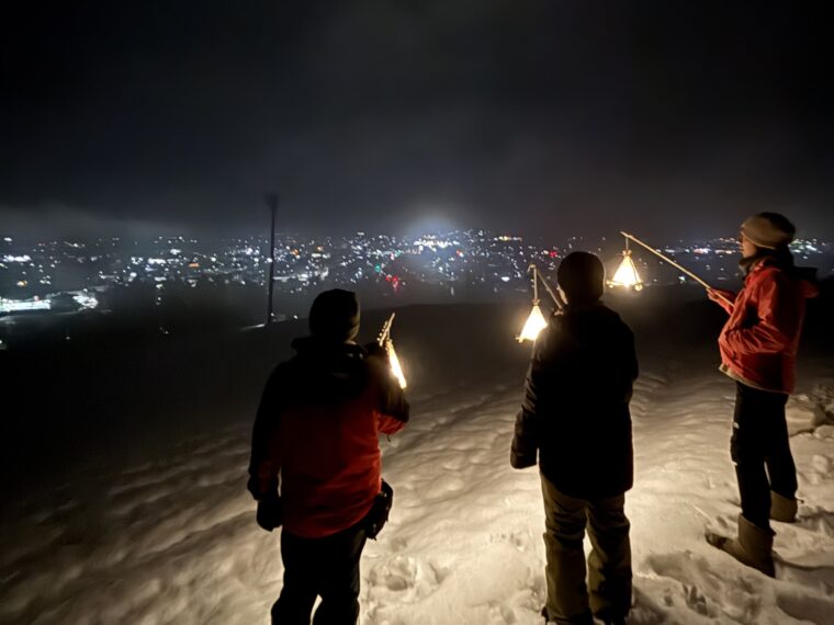 『雪の森ナイトウォーク』では、手づくりランタンで夜の森を散策! おにぎりと温泉付きで心も体も温まります。