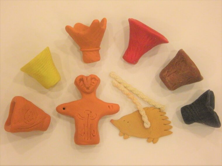 熱すると固くなるオーブン粘土を使って土器などのミニチュアを作り、専用の道具を転がして縄の模様(縄文)を付けましょう。
