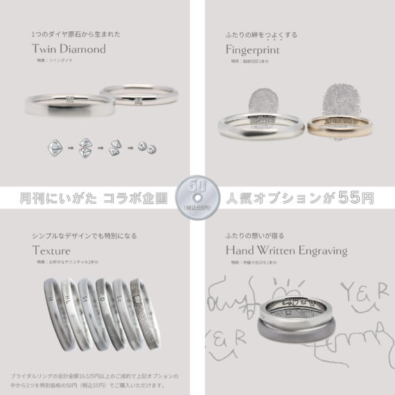 「ツインダイヤモンド」「手書き刻印」「指紋刻印」「テクスチャ加工」の中からお好みで1つ選べます。