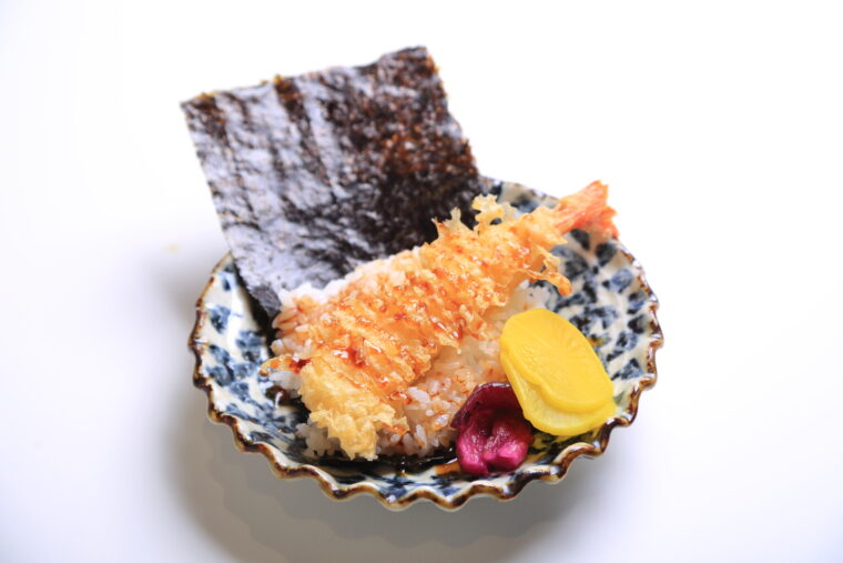 ドーンと大きな海老天に、さんかくとまるで使用しているオリジナルの黒海苔と県産コシヒカリ!