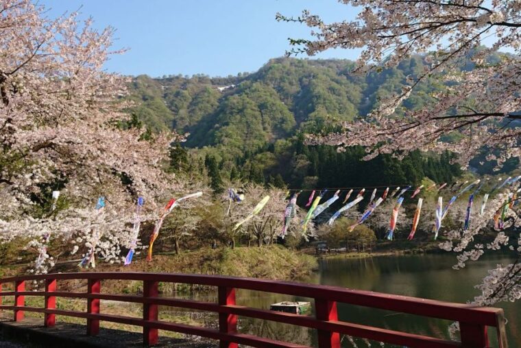 やわらかな桜色に包まれた湖の上では、地元グループが手作りした色とりどりの鯉のぼりが、春風を受けて優雅に泳ぎ、訪れる人の目を楽しませてくれます。