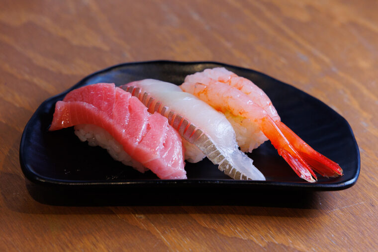 ネタ本来のうまみやとろける食感を最大限に引き立てるためにシャリはふんわりと小ぶりに握られ、上に大きくカットしたネタが贅沢にのせられています。