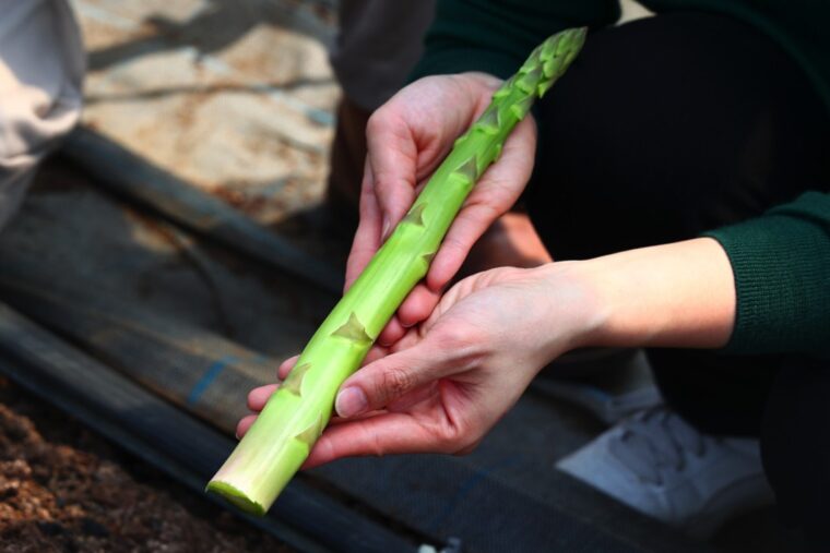 実際に収穫の様子を見せてもらいました。アスパラガスの長さを測る30cmの棒を使い、地面から長さを確認して切り取ります。