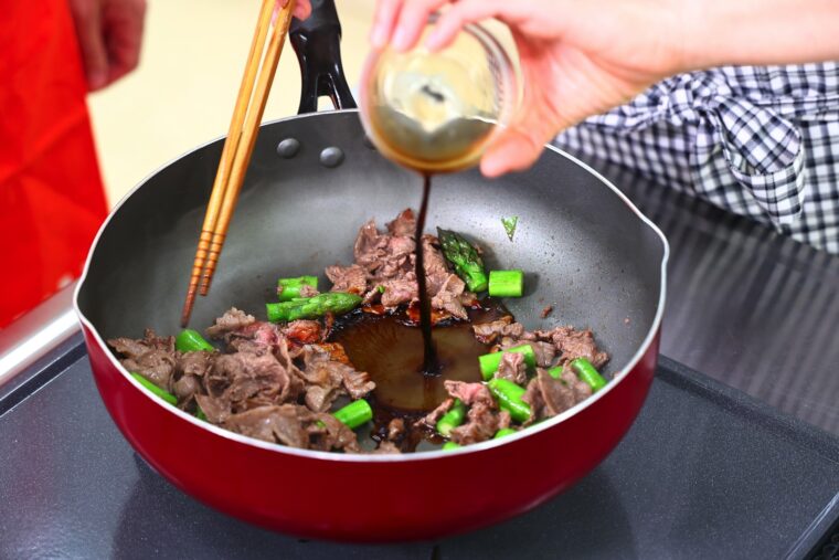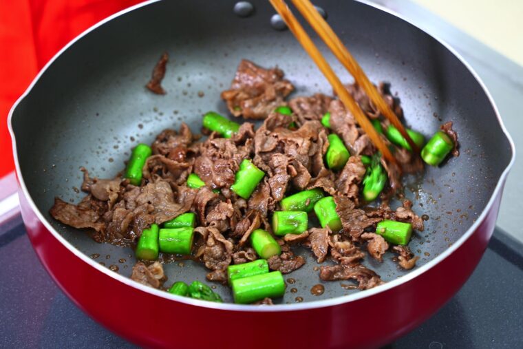 (3).アスパラガスをフライパンの端に寄せて、空いたスペースで牛肉を炒める。牛肉の色が半分変わったらニンニク、砂糖、醤油の順に加えて、汁気がなくなったら火からおろす。