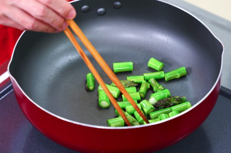 (2).フライパンに油を熱してアスパラガスをさっと炒める。アスパラガスに油がまわって色が鮮やかになったら、塩をひとつまみ振る。