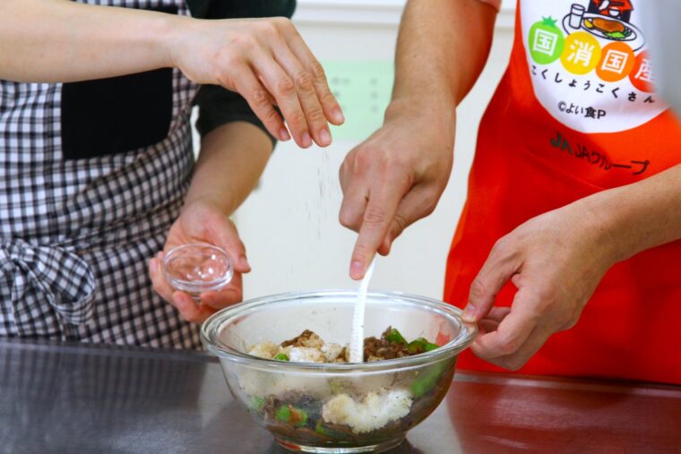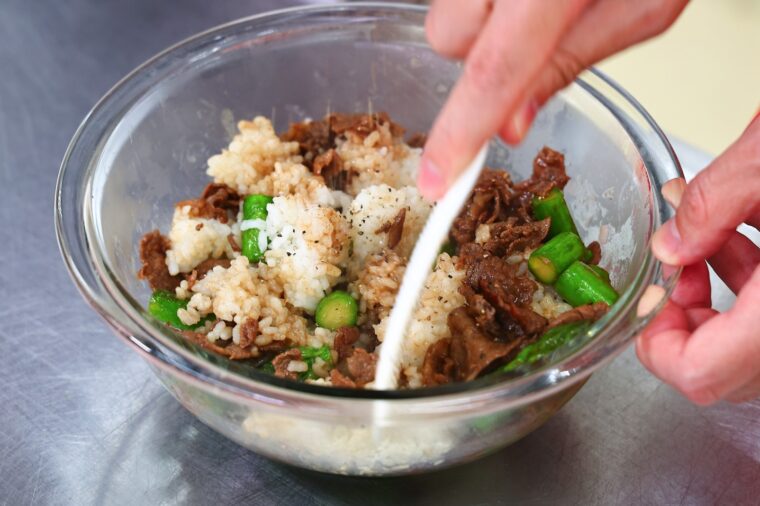 (4).ごはんにバターと(3)を入れてよく混ぜる。塩、コショウで味を整えて完成。