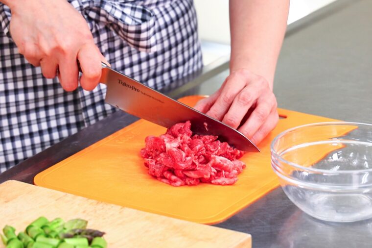 (1).アスパラガスのハカマ(茎についている褐色の三角形の部分)を取り除き、2cm幅に切る。牛肉を4cm幅に切る。