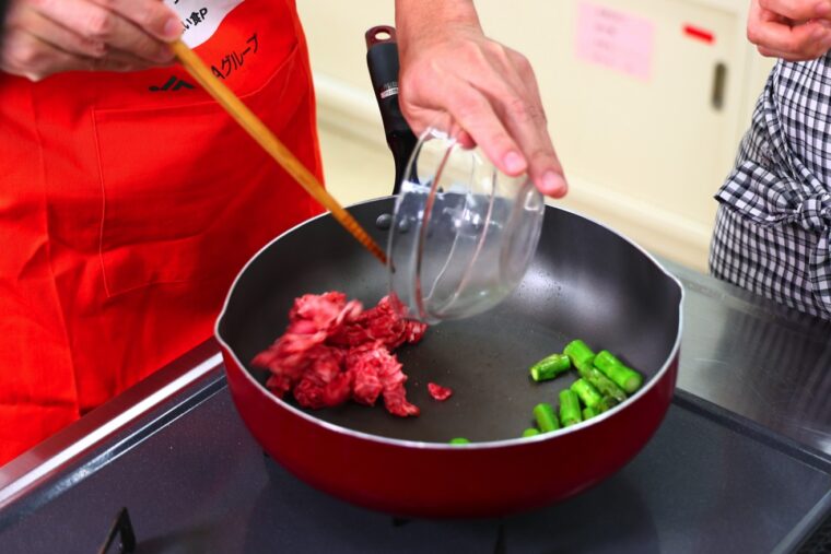 まずは村山先生のレシピからスタート。今回は、アスパラガス同様、新発田エリアの特産品である「新発田牛」も使い、とってもおいしい一品を作ってくれました。