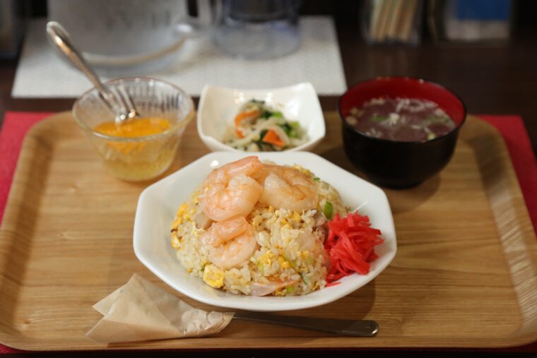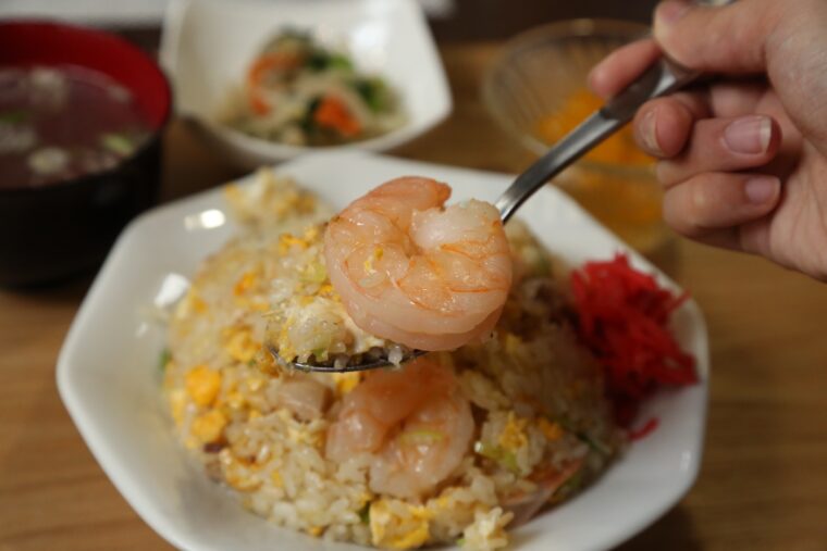 チャーハンのなかでもひときわ人気なのが写真上の『えび炒飯』。大ぶりのバナメイエビがゴロゴロ入っていて、エビ好きにはたまりません!