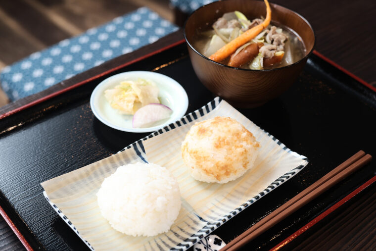 おすすめは好みのおにぎり2 個に野菜たっぷりの味噌汁と漬物が付く『一汁一菜セット(にぎりめし)』。