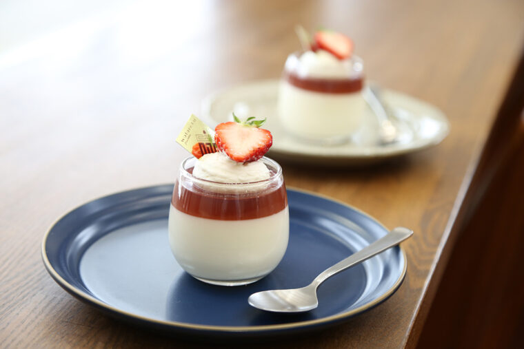ナコッタに、ほどよい酸味のローズヒップゼリー、五泉産の越後姫をオン。香り豊かなパンナコッタに、プルプルのローズヒップゼリーが相性抜群! 甘さ控えめで食後にもぴったりです!