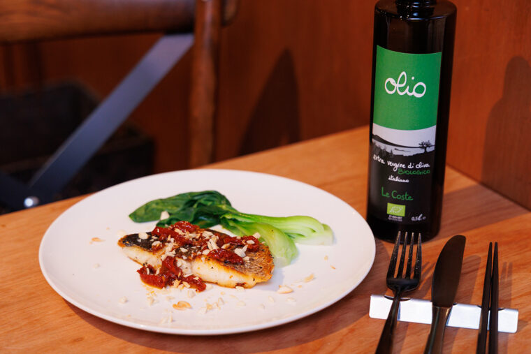 「身がふわっふわです。ドライトマトの酸味と濃厚なうまみがよく合います。おいし〜」。