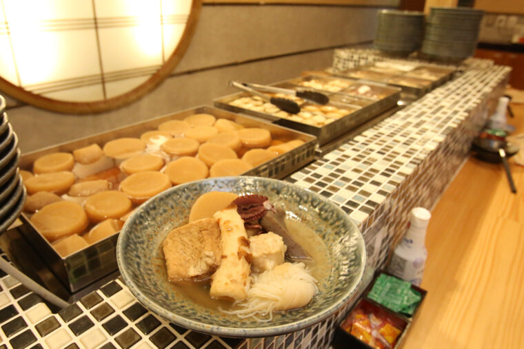 まず盛り合わせが提供され、その後皿をおでんカウンターに持参すれば好きな具材を好きなだけおかわりできます!