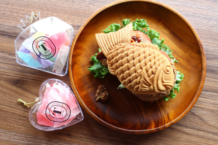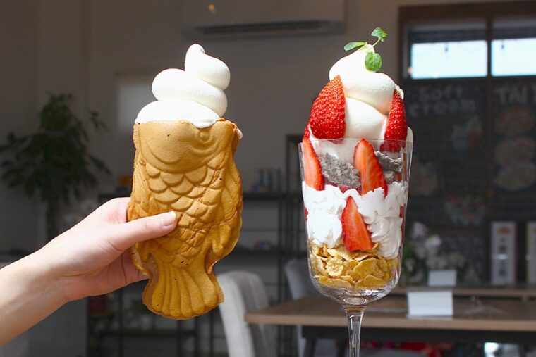 ビッグなたい焼きにぽってりとしたソフトクリームをのせた『たい焼きソフトクリーム』(600 円)をはじめ、ハンバーグなどを挟んだ食事系たい焼き『たい焼きサンド』(600 円)、旬のフルーツを贅沢に使ったパフェといったアイデアメニューを多数提供しています。
